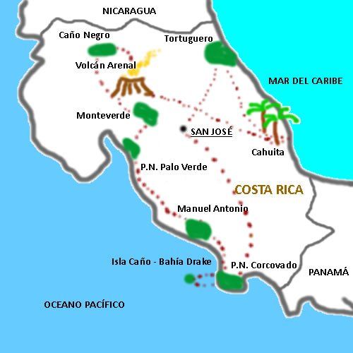 Tortuguero, P.N. Cahuita, Volcán Arenal, Caño Negro, Bosque Nuboso Monteverde, P.N. Palo Verde, P.N. Manuel Antonio, Bahía Drake, P.N. Corcovado